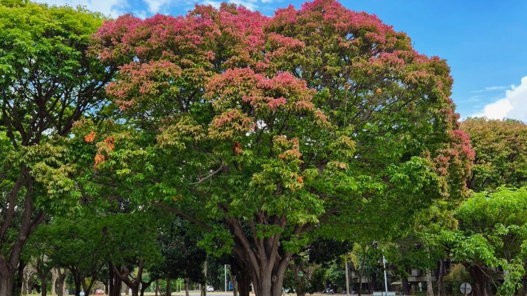 A florada das sapucaias (Lecythis pisonis) esconde uma curiosidade interessante. As árvores que colorem o Distrito Federal nesta época do ano chamam a atenção pelo tom avermelhado de suas copas — e o que muitos pensam ser flores, na verdade, são folhas jovens. O fenômeno ocorre porque as folhas brotam com coloração rosada, rubra ou arroxeada antes de se tornarem verdes, resultando em um espetáculo visual que destaca a diversidade da arborização do DF.