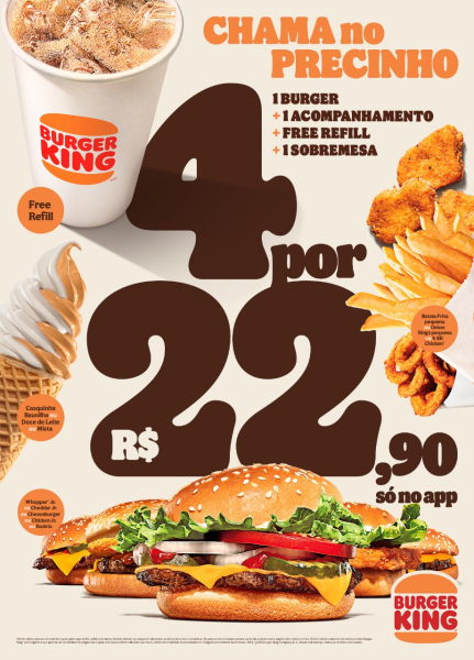 Rebatendo os concorrentes, o Burger King® anuncia uma nova oferta chamada “CHAMA no PRECINHO”, por apenas R$22,90 disponível no app. Agora os consumidores de todo o Brasil terão acesso a uma oferta de preço fixo que combina variedade e itens icônicos da marca, como Whopper® Jr., Onion Rings, Free Refill e Casquinha de Doce de Leite.