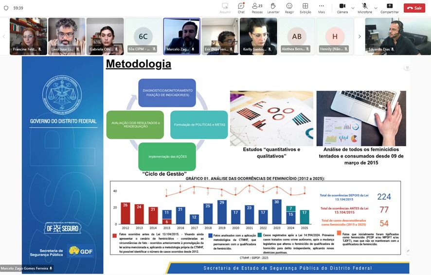 O coordenador da Câmara Técnica de Monitoramento de Homicídios e Feminicídios, Marcelo Zago, apresentou o estudo Governança baseada em evidências no DF: como a CTMHF transforma dados de feminicídios tentados e consumados em decisões operacionais e políticas públicas. O trabalho detalha o modelo de governança de dados que permite acompanhar o ciclo completo dos casos — da ocorrência ao desfecho processual —, gerando diagnósticos estratégicos que orientam decisões e políticas de prevenção.
