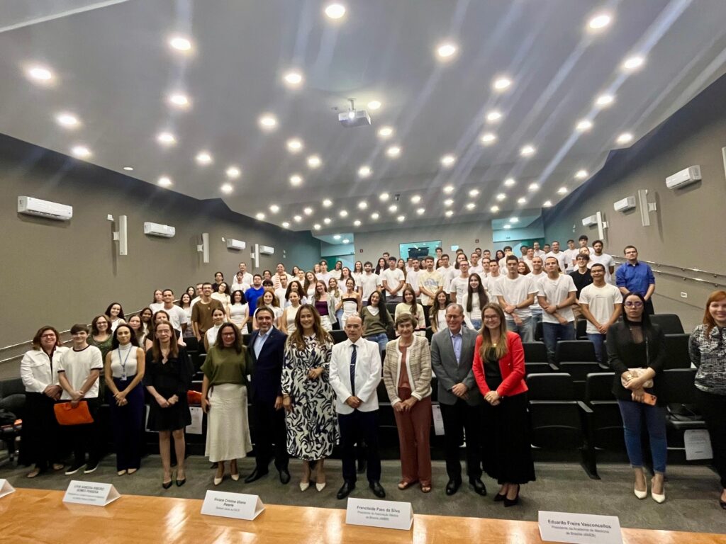 Em seguida, os estudantes foram apresentados às principais entidades médicas, com o objetivo de introduzi-los à estrutura da profissão e às suas representações. Posteriormente, acompanharam uma palestra da docente Lícia Mota, da Universidade de Brasília (UnB), com o tema “O friso da medicina”.
