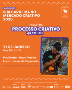 No dia 31 de janeiro, o Jovem de Expressão, em Ceilândia, recebe o artista e designer Hugo Pereira para a palestra “Desvendando o Processo Criativo”. A atividade integra a programação “Sua Carreira no Mercado Criativo” e propõe uma experiência prática e reflexiva sobre como as ideias surgem, se desenvolvem e ganham forma no cotidiano da criação.