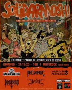 Realizado em parceria pela Mosh Produções, Eu Solidário e Motorock & Cia, o SOLIDARMOSH! aposta na diversidade sonora e na pluralidade como ferramentas de transformação. No palco, headbangers e punks compartilham o mesmo espaço em um mosh visceral, embalado por diferentes vertentes do rock e do metal produzidos no Distrito Federal.